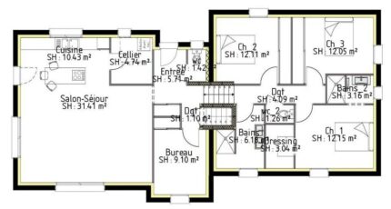 Plan maison 6 pièces 4 chambres Surface maison 123 m2