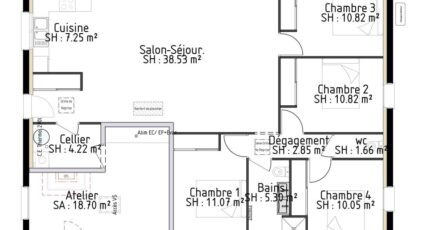 Plan maison 6 pièces 4 chambres Surface maison 102 m2