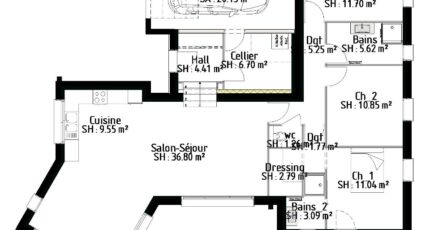 Elle se compose d'une surface habitable de 110m² comprenant un espace salon/séjour de 45 m², d'une cuisine ouverte, et d'un coin nuit. Dans l'espace nuit on y trouve 2 grandes chambres avec salle d'eau et une suite parentale.