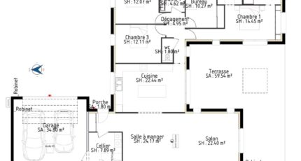 Plan maison 6 pièces 3 chambres Surface maison 145 m2