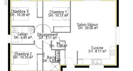Cette maison de plain pied de 71m² habitable est un projet optimisé en 3 chambres sans garage.