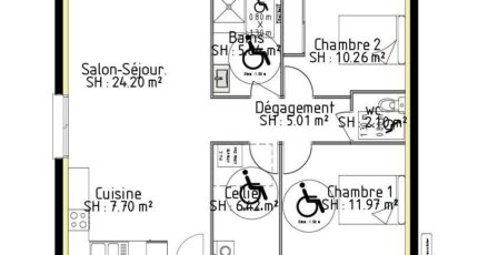Cette maison de plain-pied de 73m², conforme aux normes PMR, est parfaite pour un investissement locatif. Elle offre un salon-séjour traversant de 31m², deux chambres spacieuses, une salle d'eau et un WC indépendant. Son agencement pratique et accessible en fait un bien idéal pour répondre aux besoins de tous, tout en garantissant un confort optimal.