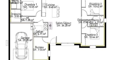 Ce plan est très fonctionnel et allie esthétique, modernité avec une ligne évolutive pour cette maison de plain-pied.