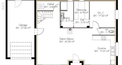 Elle se compose d'un spacieux espace de vie de 53m² avec cuisine, cellier, salon / séjour au rez de chaussée et d'une suite parentale avec dressing et salle d'eau privatifs.