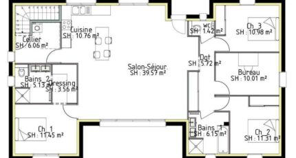 La pièce de vie est centrale avec de chaque côté 2 coins nuit : un avec chambre parentale (avec dressing + salle de bain), et l'autre avec 2 chambres d'enfants et un bureau transformable en chambre d'amies ou salle de jeux.