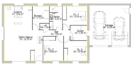 Elle se compose en 2 parties. La première, qui accueille la partie habitable avec un salon séjour cuisine de 40m², 3 chambres, une grande salle de bain, un wc séparé, un bureau et un cellier par lequel on passe pour accéder à la deuxième partie, le garage.